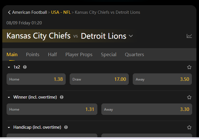We have different market option on our platform for American Football like, Home to win, Draw and Away to win: We also have Handicap