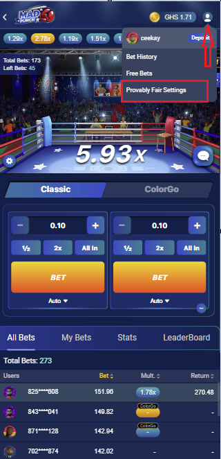 STEP 4: From the Homepage of the game, click on the PROFILE ICON at the right top corner. and Select "Provably Fair Settings" from the drop-down menu to view the page