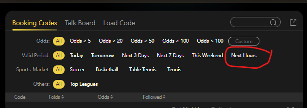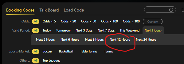 How to filter booking codes for Next 12 Hours games Only via the desktop
