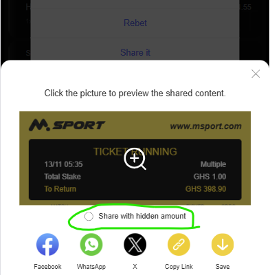 Select the Share hidden amount button to hide your stake and return amount