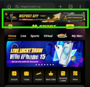 To update to the latest version, visit the site www.msport.com on a phone web browser (preferably Chrome). On the top of the page, an advertisement for the app update is displayed with a FREE DOWNLOAD tab, as seen below.