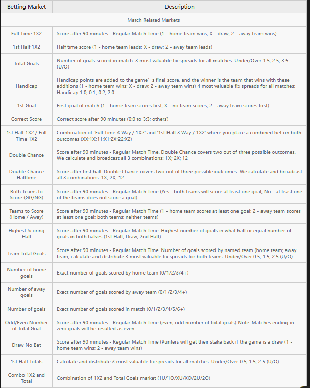 There are different bet types available in virtual football betting, similar to real football betting. Common bet types include:
