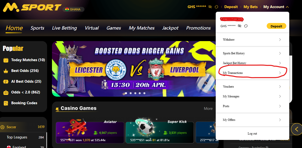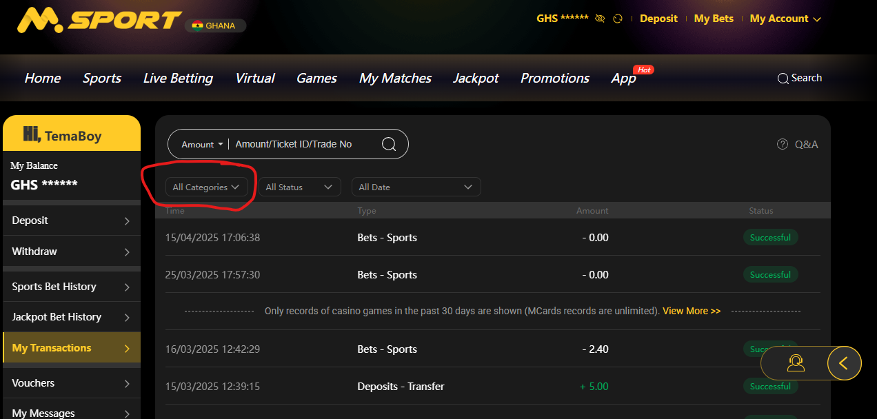 Msport has grouped the types of transactions into various categories to make locating or searching for specific transaction (s) easier. All forms of transactions, be it deposits, withdrawals, refunds, bets, or winnings. are recorded and stored in the user's account to make it easier for the user to locate a particular transaction or for future verification or security risk issues. These transactions are grouped into their various category based on the type of transaction. All the transactions can be found under the bigger category (ALL CATEGORY), which is the default view under the transaction page. Users can also choose a specific category to view transactions under that category.