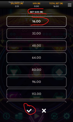 Select your preferred bet amount (minimum bet amount is #16, maximum bet amount is #40,000) Spin the reels