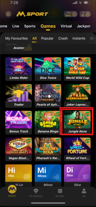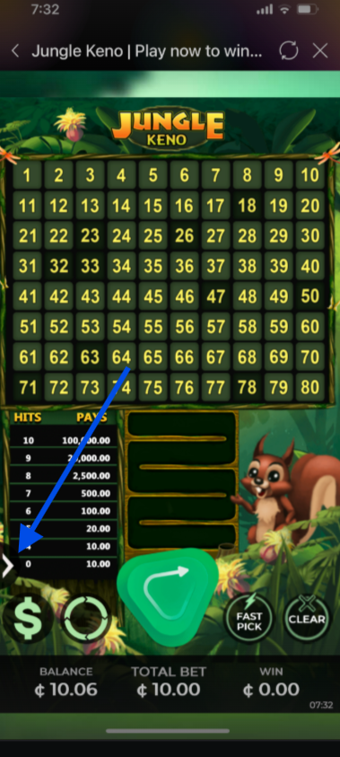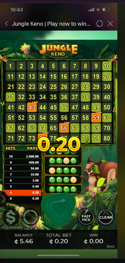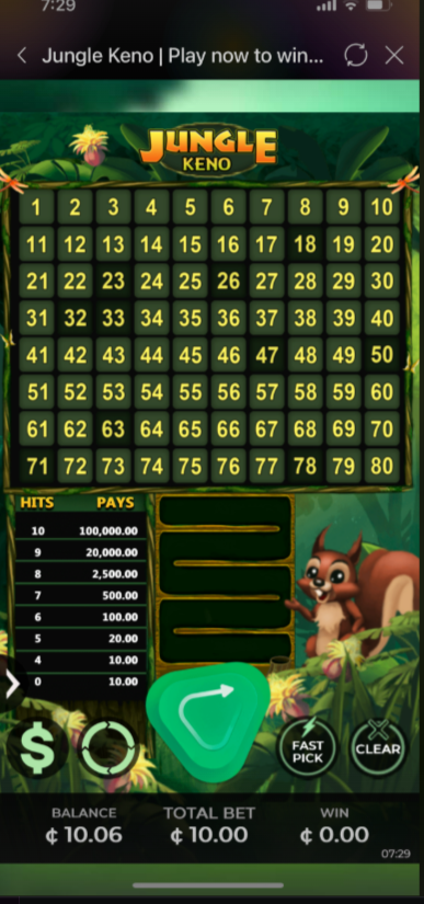Jungle Keno is an exciting new casino game where players select between 3 and 10 numbers from a pool of 80. The goal is to match your picks with the 20 numbers drawn each round to win prizes—the more matches (or "hits"), the bigger the payout...