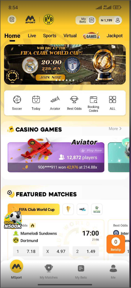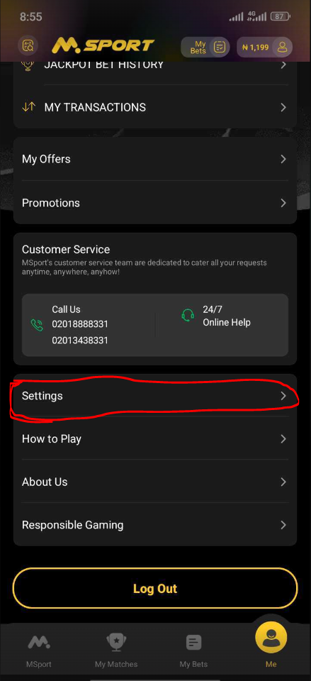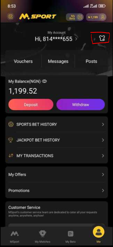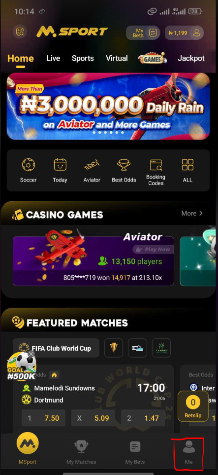 Login to your Msport app, click on the ME icon at the bottom right corner of the app.