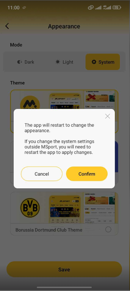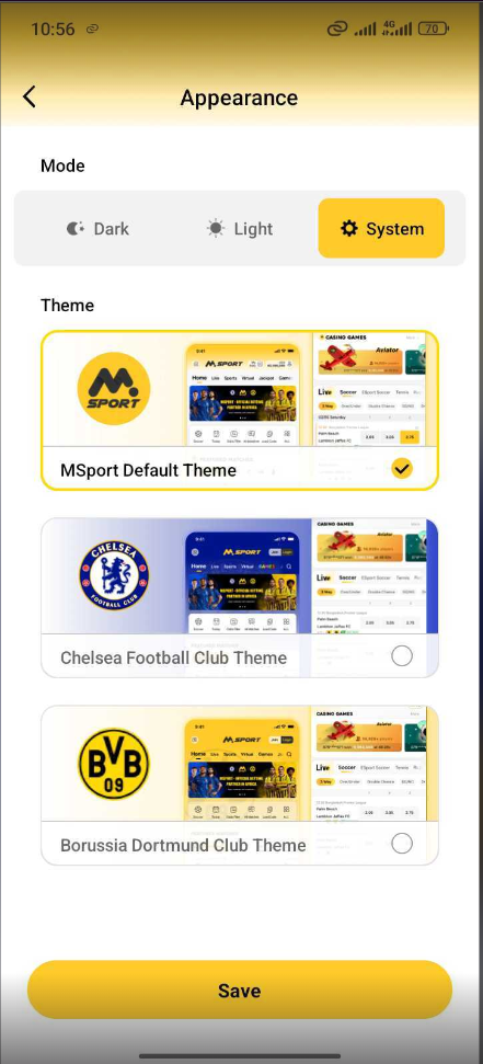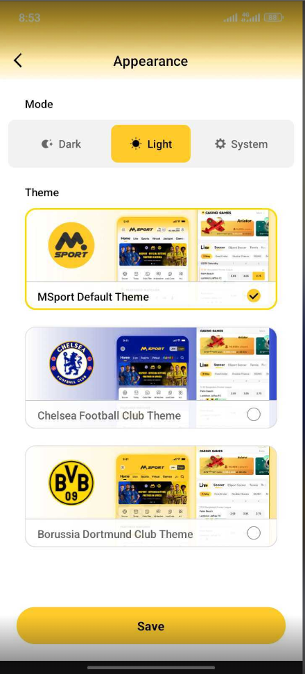 5. Dark mode consist of Msport default theme, Chelsea default theme and Borussia Dortmund club theme on dark appearance.