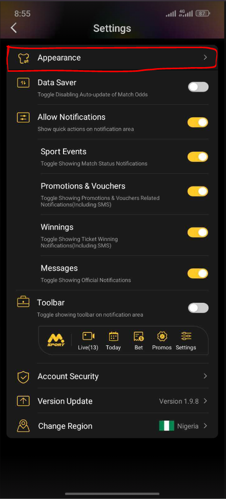Appearance have to do with the physical look or aesthetic of the app, to change the Msport app appearance, kindly follow the steps below.