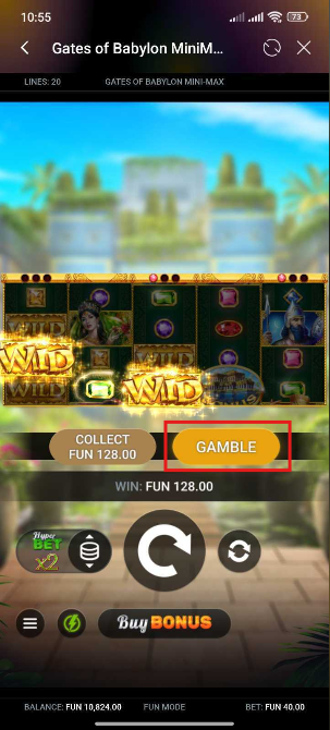If a placed bet result in a winning higher than 3 times of the bet, the gamble and collect buttons appear and you may choose to either collect the win or gamble round.