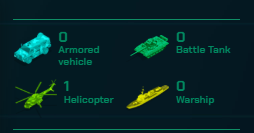 There are four types of equipment: which are Armored car, Battle Tanks, Helicopters and a warship.