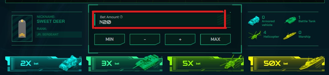 You need to make a bet before the start of the round on the type of equipment that will be destroyed at the end of the round . To do this , you enter the bet amount here .