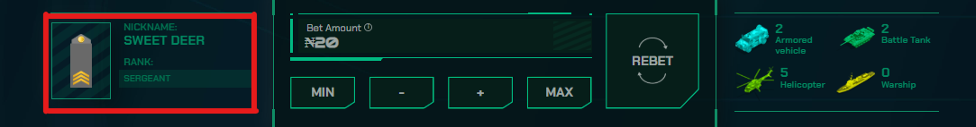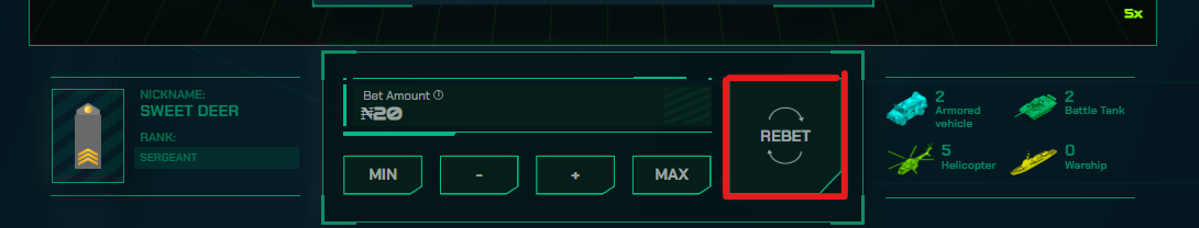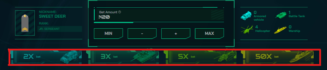 For example, you bet #20 on a tank and #30 on a helicopter, #50 , in total; the ring stops on the helicopter, so you will win x5*#30 which is #150