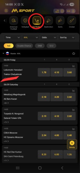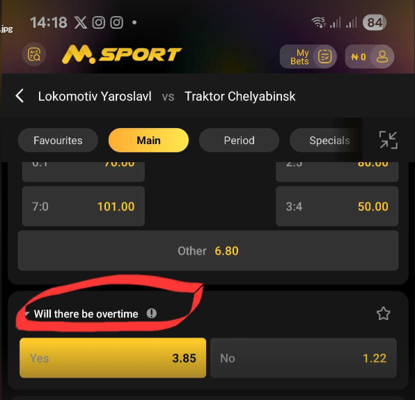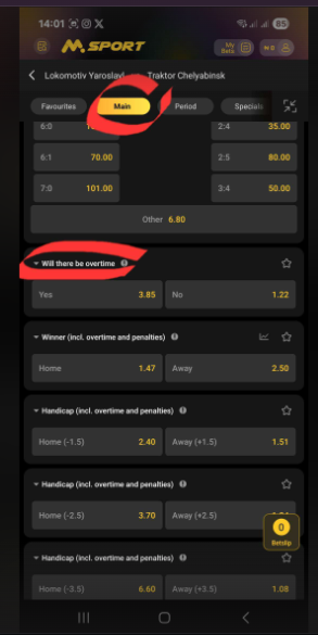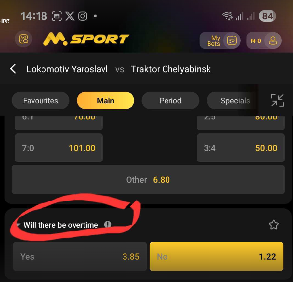 On the Msport app "Ice Hockey Overtime Yes/No", you're betting on whether the match will go into overtime or not.