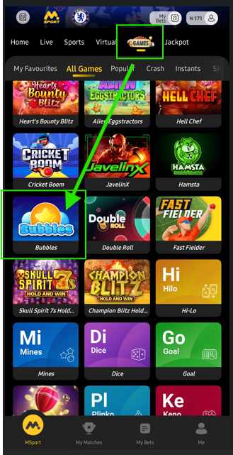 To locate the game, first, navigate to the games section on the MSport app and select Bubbles on the list of game icons, as seen below