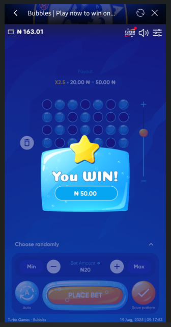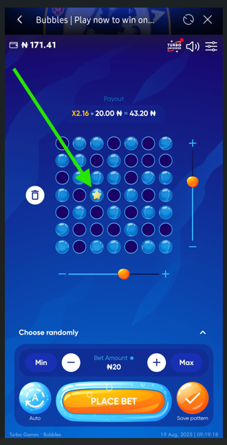 Press "Place bet" to pop chosen bubbles. - There is only 1 winning bubble with a star, regardless of the size of the playing field, so choose wisely!