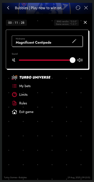To access the settings menu, click the burger icon located in the top right corner of your screen. Within the settings, you can modify your nickname, check your bet limits (minimum, maximum, and maximum profit), toggle sounds on or off, and review your betting history.