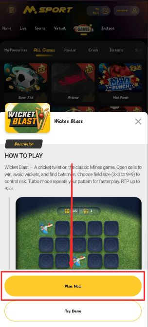 Blast is a cricket-themed classic casino game. It allows you to tap and open cells to uncover batsmen and try to avoid hidden wickets. Each safe reveal increases your potential payout however hitting a wicket ends the round. You can cash out at any time. Field sizes range from 3×3 to 9×9, and Turbo can repeat your tapping pattern for faster play.