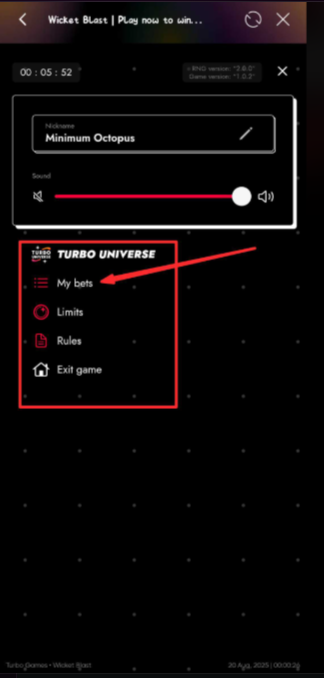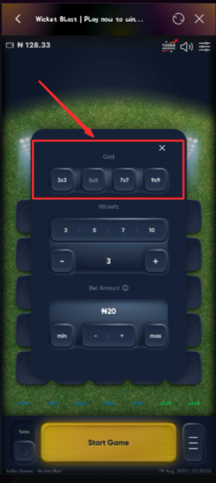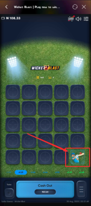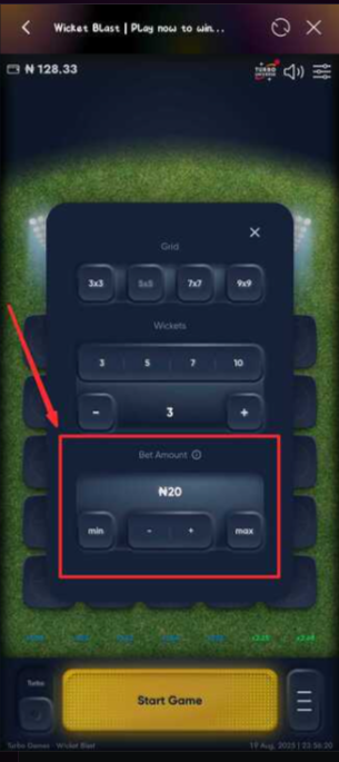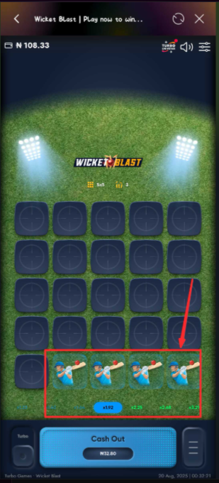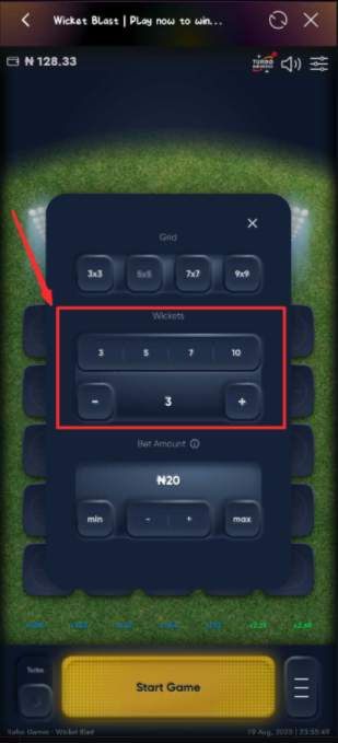 5. Confirm the wickets count shown (more wickets = harder, faster-growing multipliers).