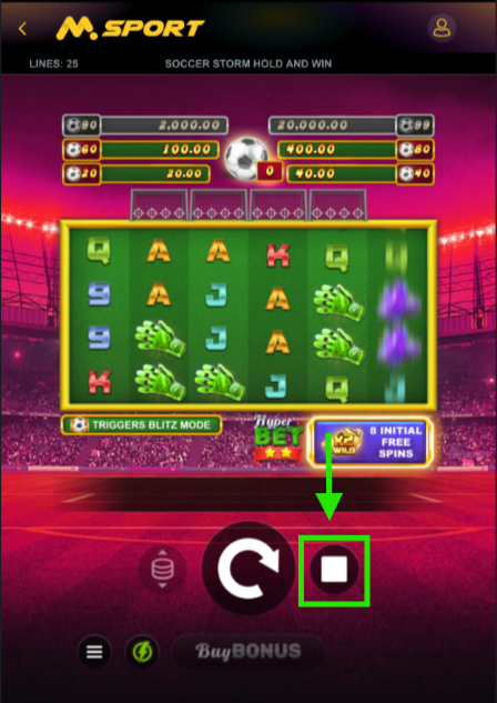 The game is started by pressing the SPIN symbol button. You can Quick Stop the game by clicking (for desktop displays) or touching (for touch-enabled displays) the SPIN button.