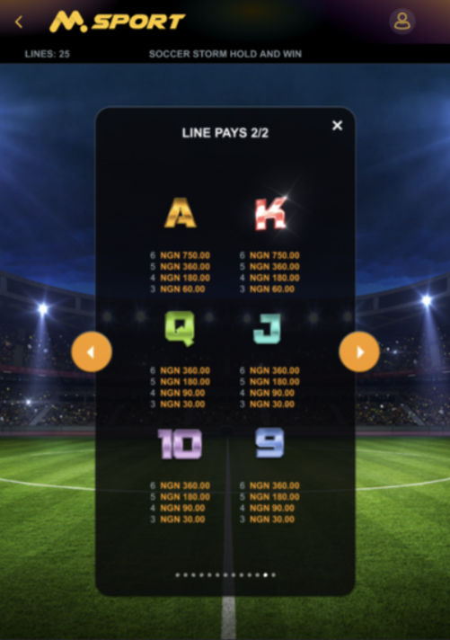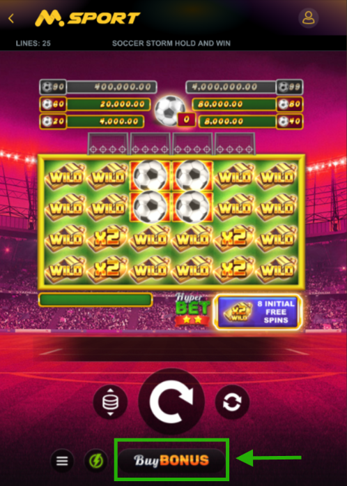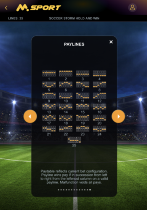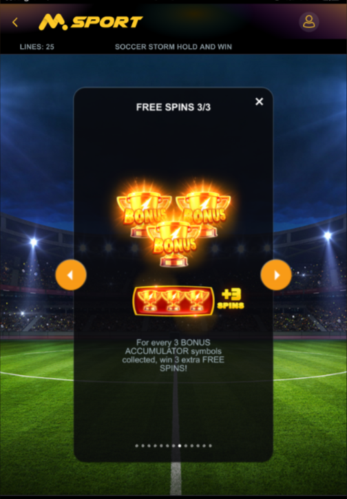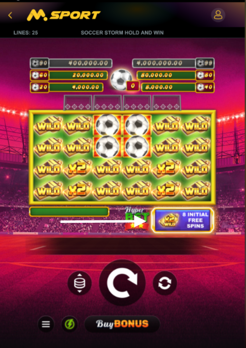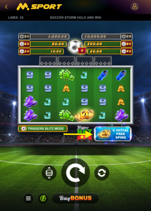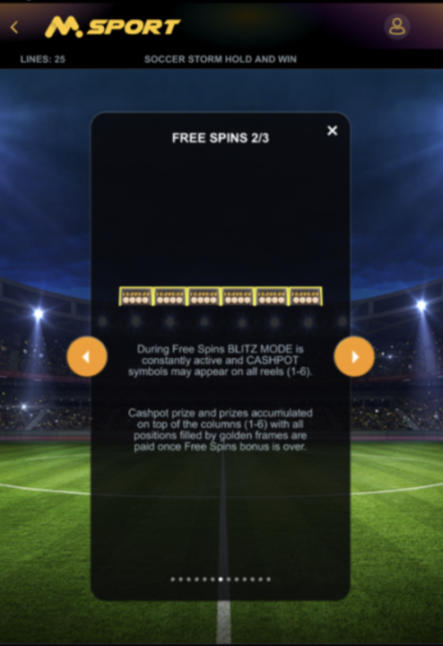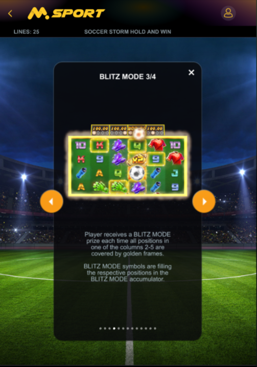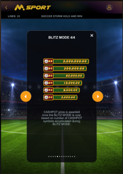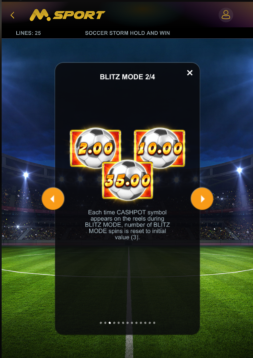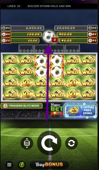 Soccer Storm Hold and Win is an exciting video slot game with 6 reels, 4 rows, and 25 paylines that are always active. The game features several bonus elements such as BLITZ MODE, Cashpots, HyperBet levels, Free Spins, and Wild Symbols.