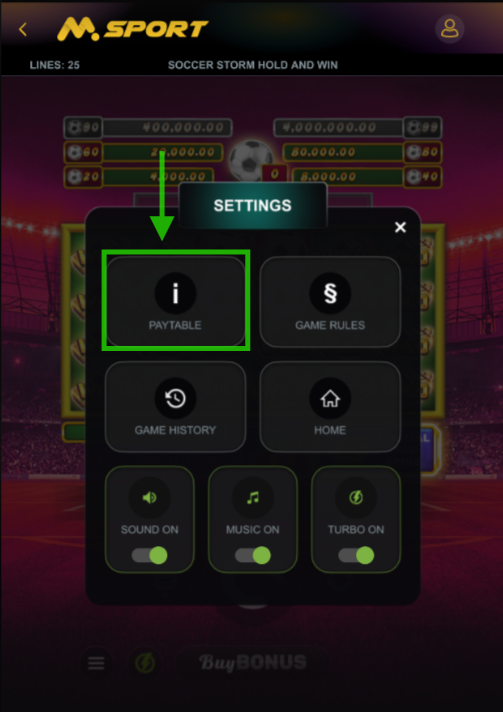 In SETTINGS, "i" symbol opens PAYTABLE.