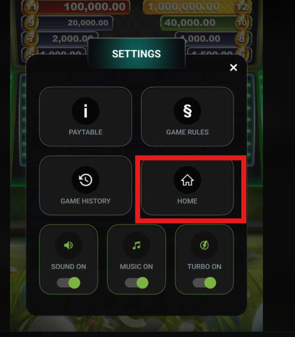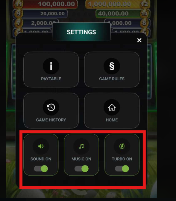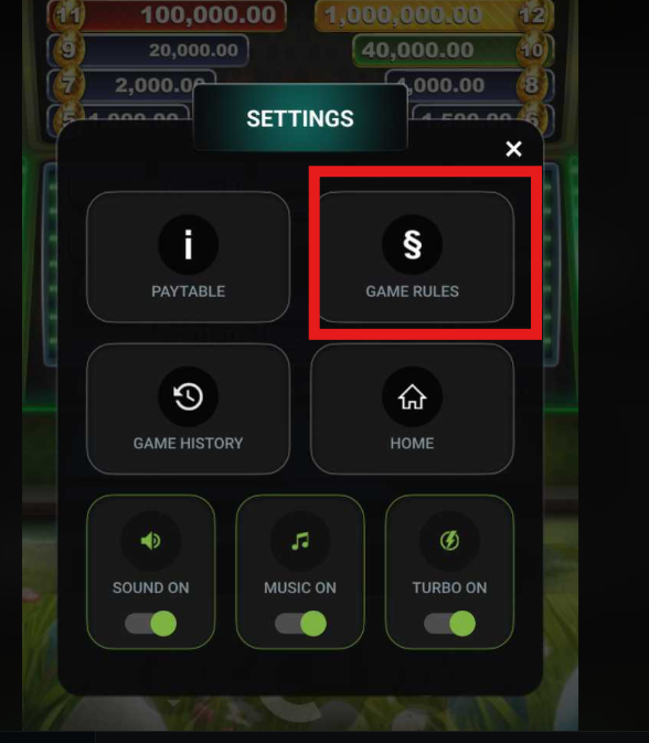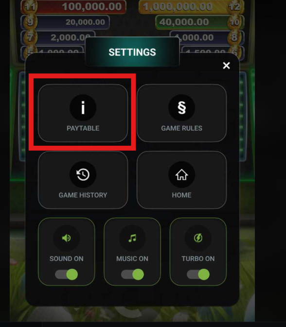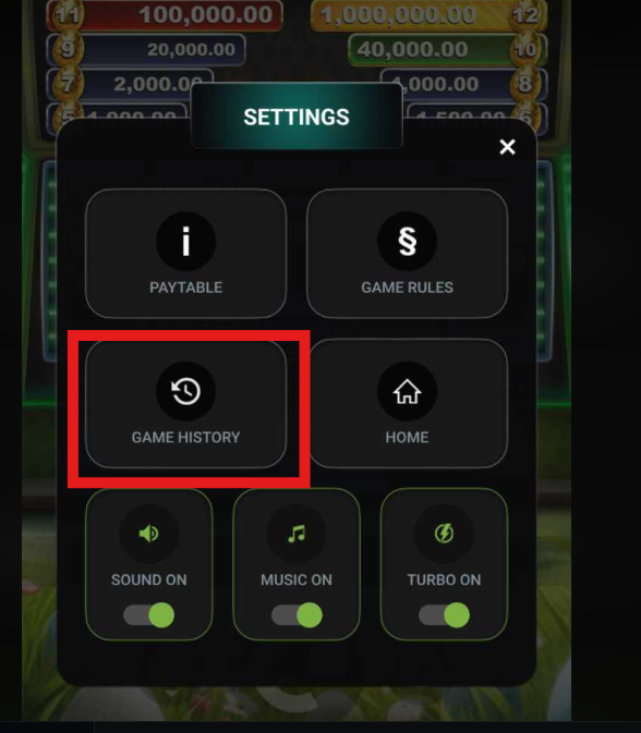 SETTINGS ICON : Tap this to access the settings menu for Sound, Music, Game History, Paytable, and Game Rules.
