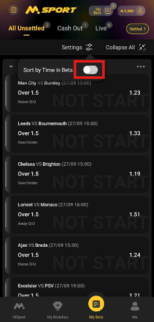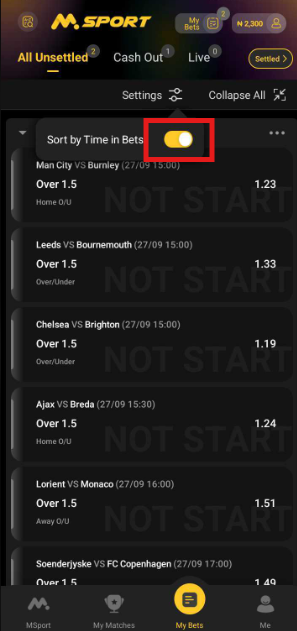 Sort by time is a new feature by Msport, this new feature gives you the opportunity to set your bets to display by their start time, this new features also let the games to be displayed at the top when they are live unlike the normal format where lives games are displayed at the bottom. You can sort the games based on their scheduled start timestamps. This is useful for event tickets or schedules involving multiple game.