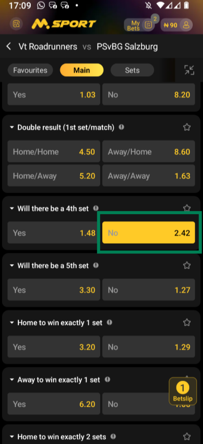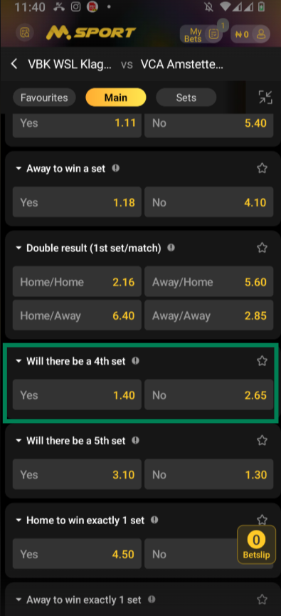 But as selected in the image below, it means the bet will be settled as won if there is NO 4TH SET in the volley bout between the two teams because the selection is on NO .