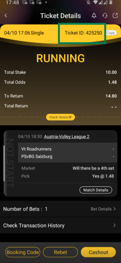 The image below describes that a selection has been made on YES there will be a 4th set in this match and the bet will be considered as WON if there is a 4th set in the Volley match between Vt Roadrunners and PSvBG Salzburg.