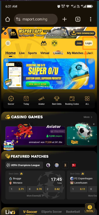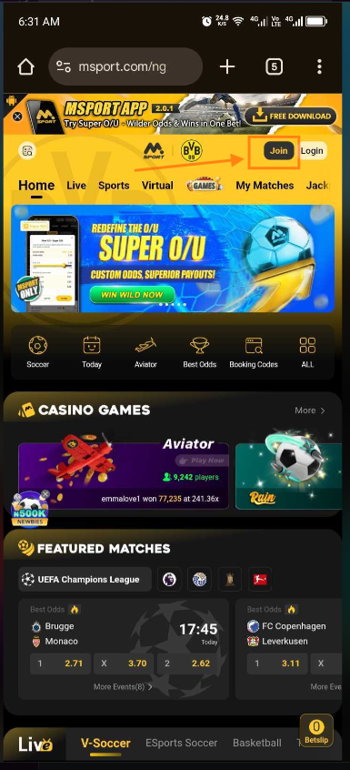 1. New Users can Register on Msport. Visit https://www.msport.com/ng/web and Click JOIN.