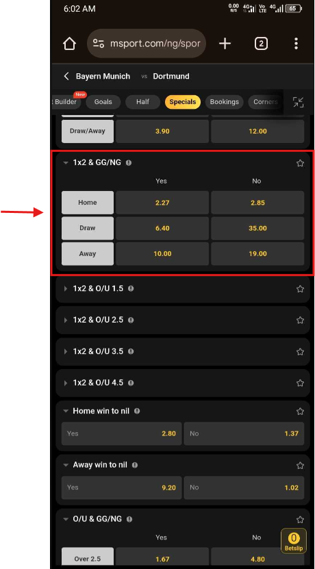 MSport excels in offering hybrid markets like "1X2 & GG/NG," where you predict both the outcome and scoring involvement. For example: