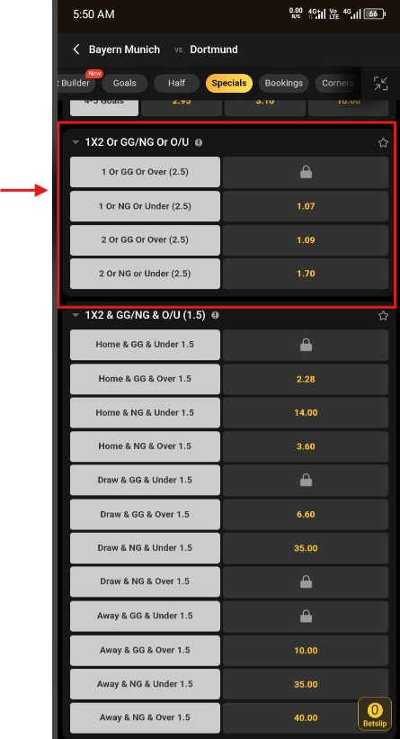 Close-up of MSport’s GG/NG market options, including combinations like 1X2 & GG/NG or with Over/Under thresholds, for a match like Bayern VS Dortmund.