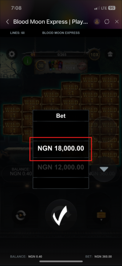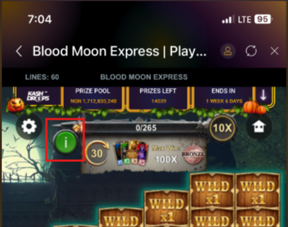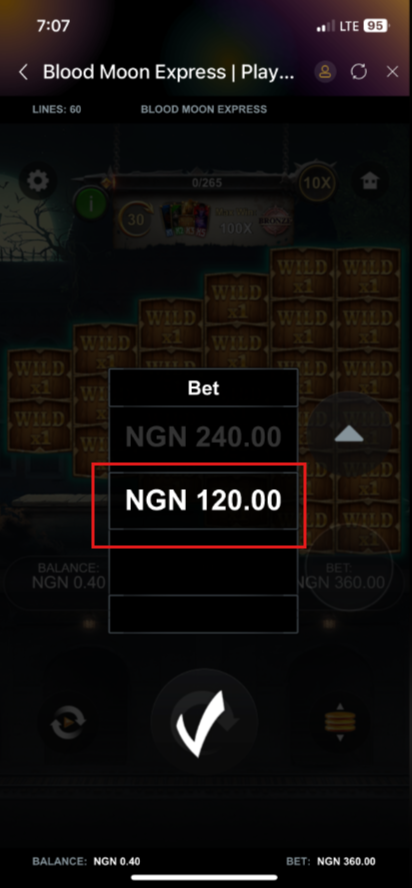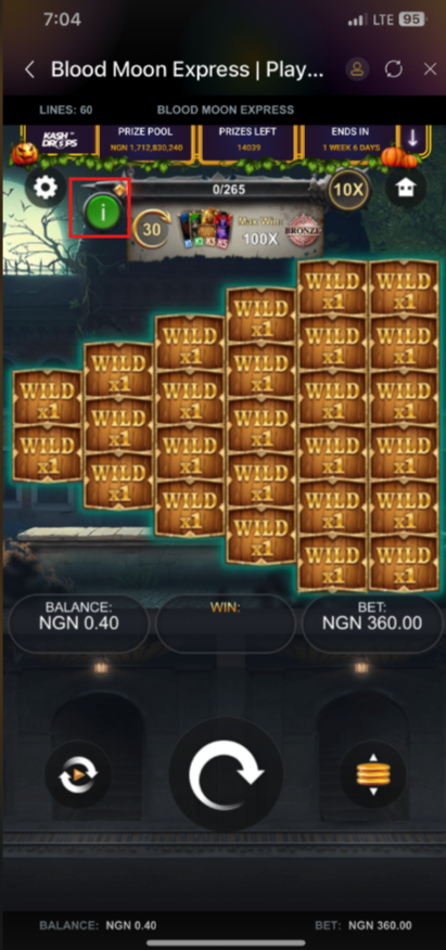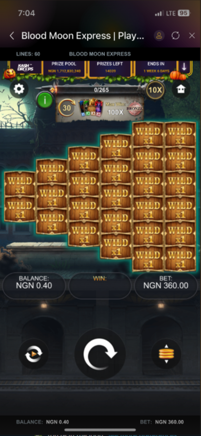 Blood Moon express is a 6 with 60 Playlines video slot game, featuring Free spin Bonus, Multiplier Wild Card Symbols, Random Wild Symbols and Missions. All 60 lines are always played as the lines determines the winning rates.