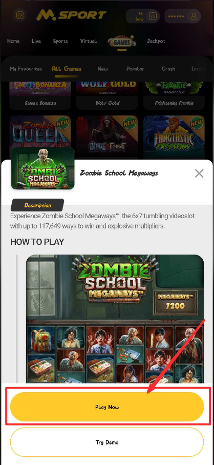 2. Click on GAMES: scroll down and select "Zombie School Megaways" then click on play now.