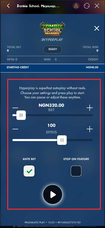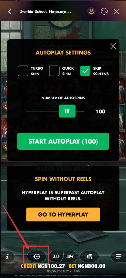 You can also set AUTO SPIN by clicking the auto spin icon. It also helps to control spin speed and use the HYPERPLAY.