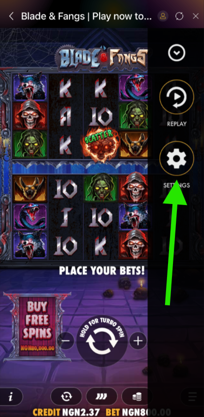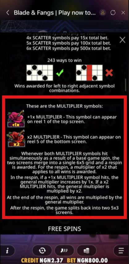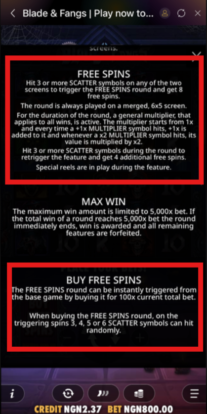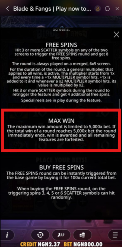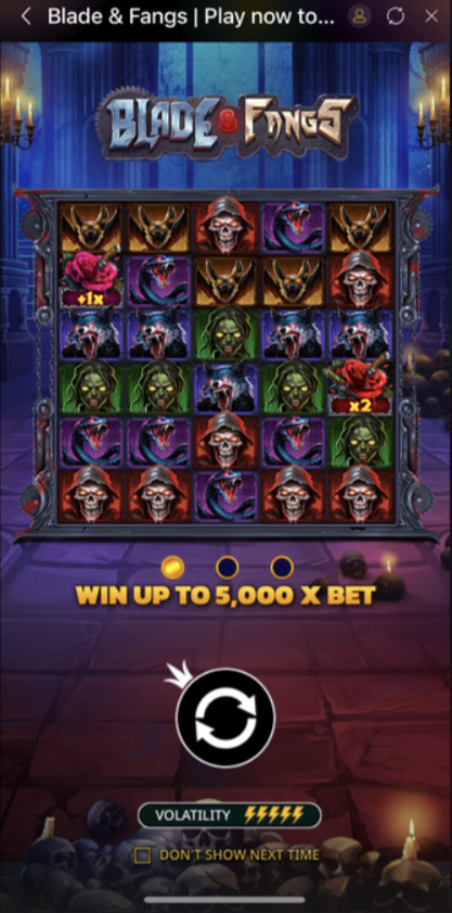 Blade & Fangs is a visually impressive, high-volatility online slot offering thrilling gameplay and the chance for large payouts. It features scatter symbols, Multiplier sysmbols, and Free spins. It a unique dual-screen mechanic and a max win of up to 5,000x your bet, The maximum payout is N10,000,000. The game has a fair RTP of 96.03% in regular play and 96.01% when using the Buy Free Spins option.