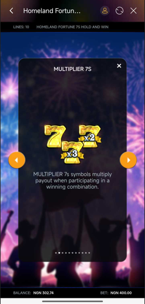 Homeland Fortune 7s Hold and Win is a 5-reel, 3-row slot game with 10 paylines video slot game, featuring HOLD AND WIN bonus, CASHPOTS and MULTIPLIER WILDS. The game’s theme revolves around a rich, exotic homeland filled with lucky symbols, including the iconic 7s, gold coins, and other fortune-bringing icons. The game combines traditional slot elements with modern mechanics, creating a thrilling and potentially lucrative gaming experience.