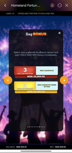 If the player selects to play a BuyBonus, HOLD AND WIN BONUS is awarded immediately with a number of initial spins according to the selected option. For each BuyBonus option, bet and number of initial spins are shown. After a selection is confirmed, the HOLD AND WIN BONUS variant is played with the selects number of initial spins, and with the same bet as is active on the game interface immediately the selection is made.