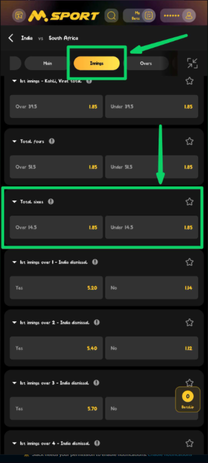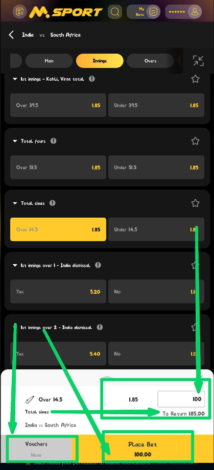 Msport will present a line such as Over 14.5: You are betting that 15 or more sixes will be hit in the match.
