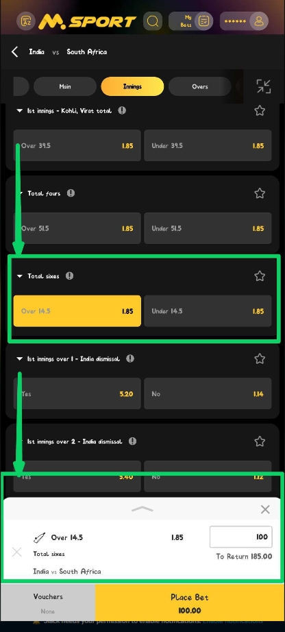 Msport will present a line such as Over 14.5: You are betting that 15 or more sixes will be hit in the match.