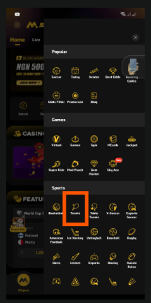 Kindly click on the particular Tennis game then click on 1st set winner and select home as your preferred selection in this case as home is our focus and proceed to place with the desired amount of stake as shown below.