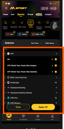Then click on Tennis and select the tennis games you wish to place your stake on and apply as shown below