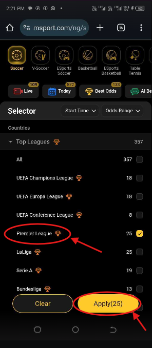 5. Select The Country/Region League or Cup Match You Want To Place Bet On And Click On Apply.