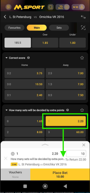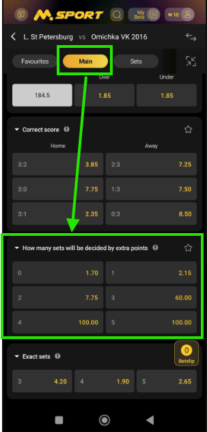 4 sets decided by extra points: This option is available for a best-of-5 match where you predict that all four sets will go to extra points.