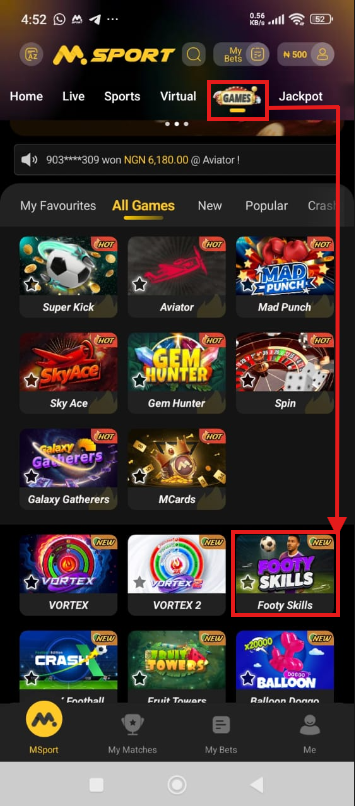 To locate the game, first, navigate to the games section on the MSport app and select Sugar Rush on the list of game icons, as seen below.