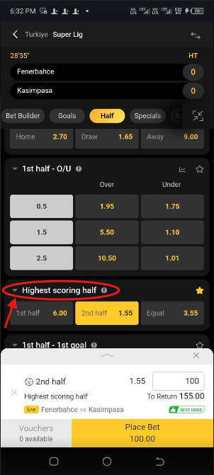 A 1st Half Highest Scoring bet wins if the first 45 minutes of a soccer game see more goals than the second. The market is not just about total match goals, but rather the distribution of those goals across the 90 minutes. It is important to remember that injury time at the end of each half counts towards that specific half's total.