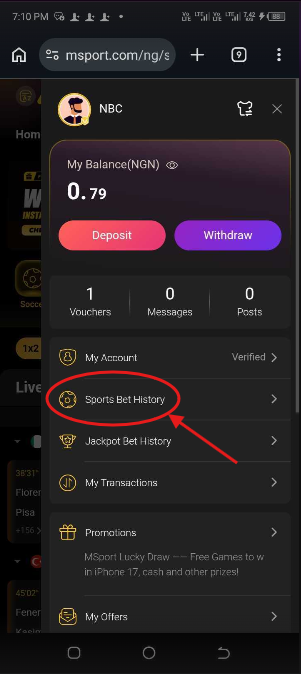 2. Click on Sports Bet History