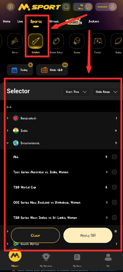 2. Navigate to CRICKET in the SPORTS section.