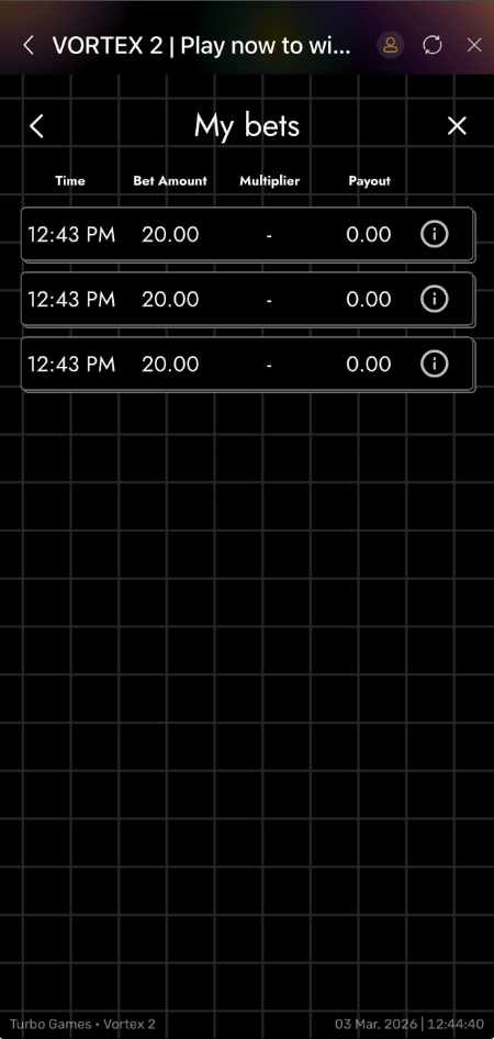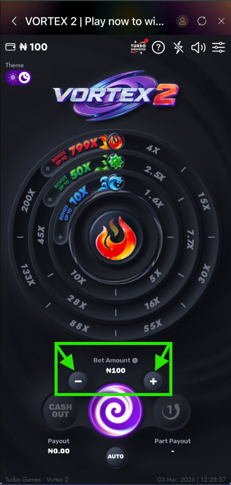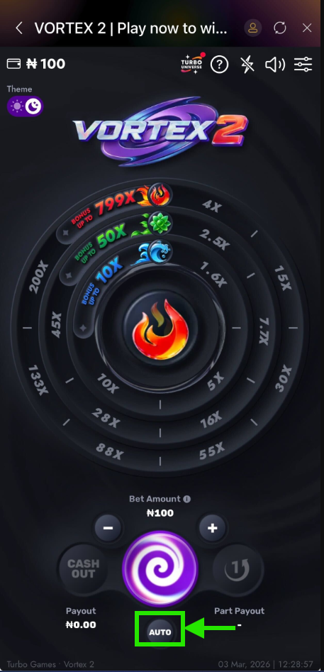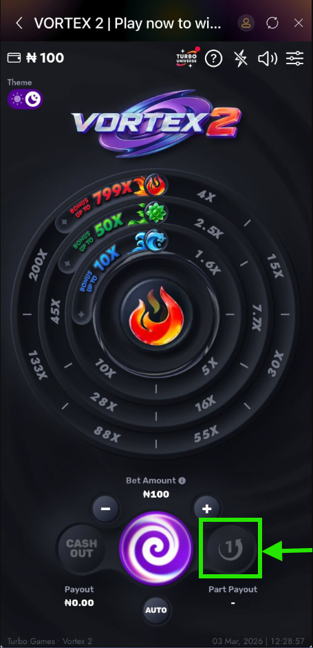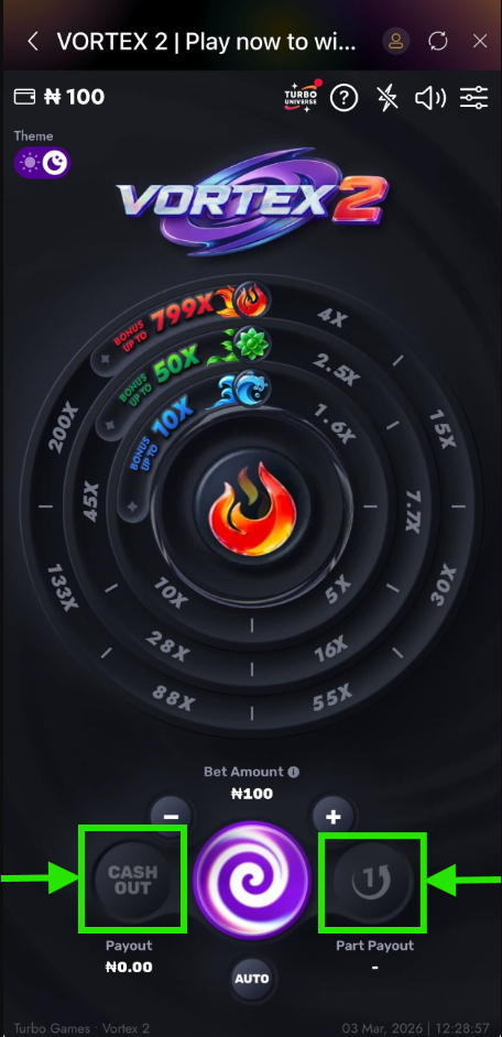 - Cash Out & Sequential Cashouts - Uniquely in Vortex 2, you can perform consecutive cashouts within a single round. For example, after an automatic cashout (from a bonus), you can still perform a "Part PayOut" or a full "Cash Out" if there are remaining funds.