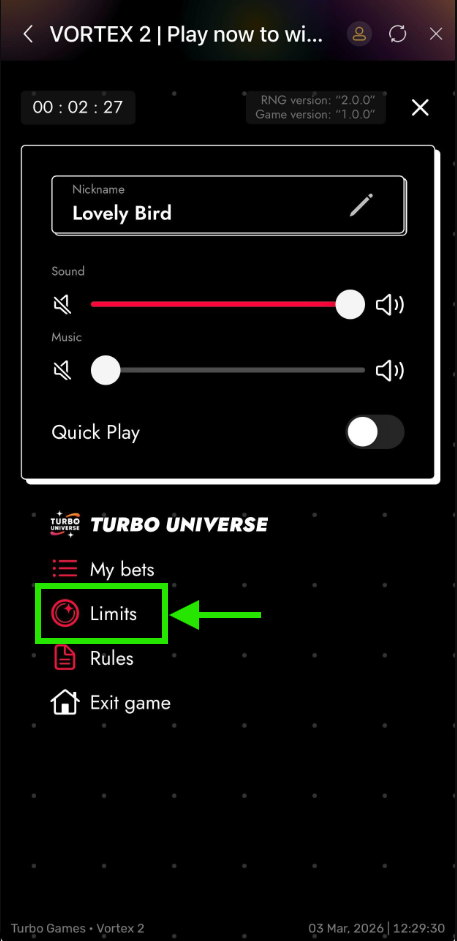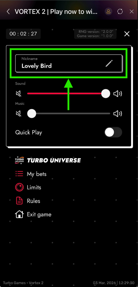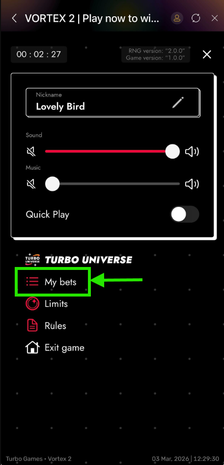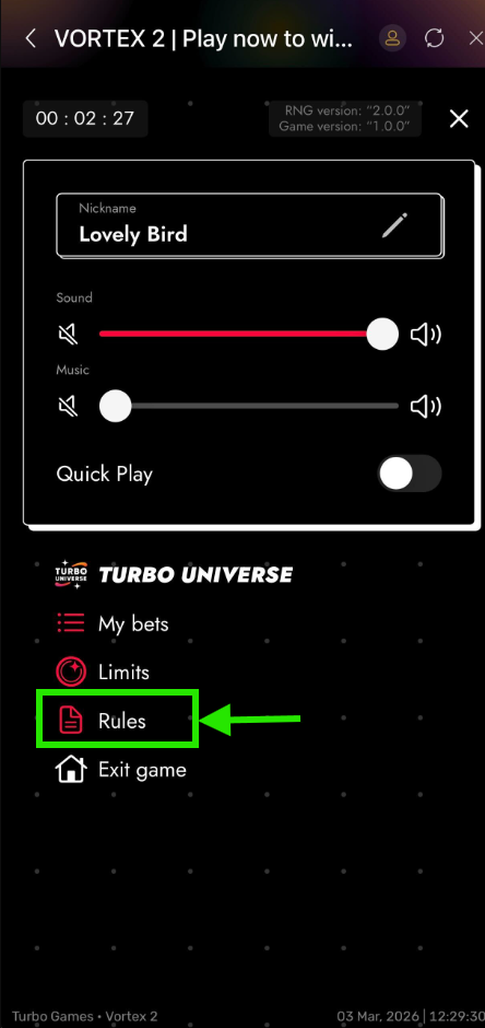 Under settings, players can view game rules, game history, customize nickname personalize game theme, enable/disable sound & turbo features and view bet limits.